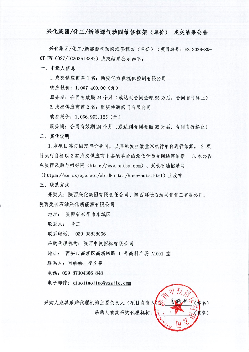 兴化集团、化工、新能源气动阀维修框架(单价)成交结果公告