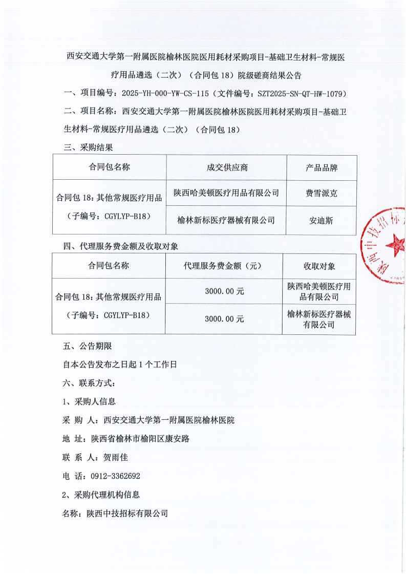 西安交通大学第一附属医院榆林医院医用耗材采购项目-基础卫生材料-常规医疗用品遴选(二次)(合同包18)院级磋商结果公告