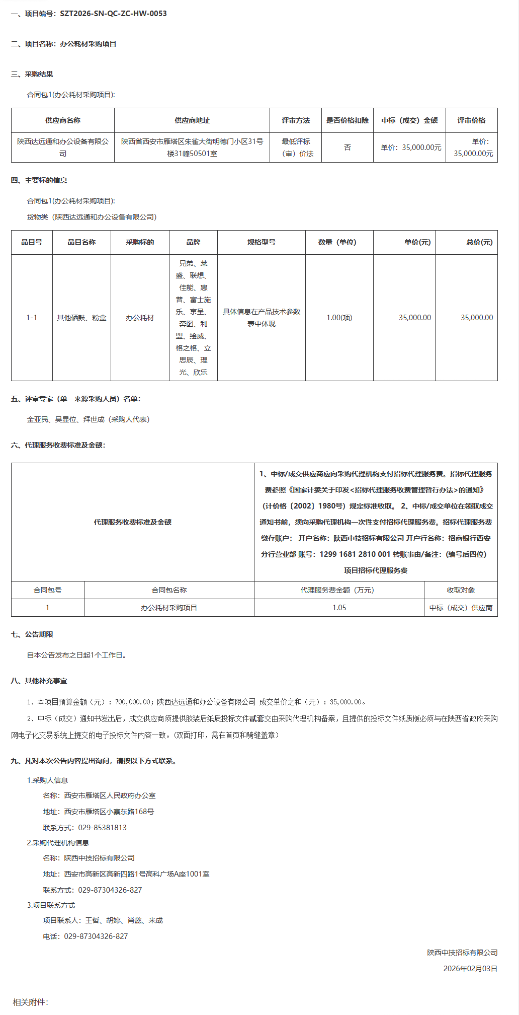 西安市雁塔区人民政府办公室办公耗材采购项目中标(成交)结果公告