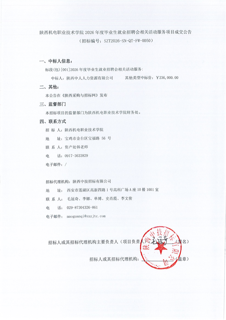 陕西机电职业技术学院2026年度毕业生就业招聘会相关活动服务项目成交公告