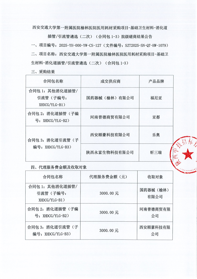 西安交通大学第一附属医院榆林医院医用耗材采购项目-基础卫生材料-消化道插管、引流管遴选(二次)(合同包1-3)院级磋商结果公告