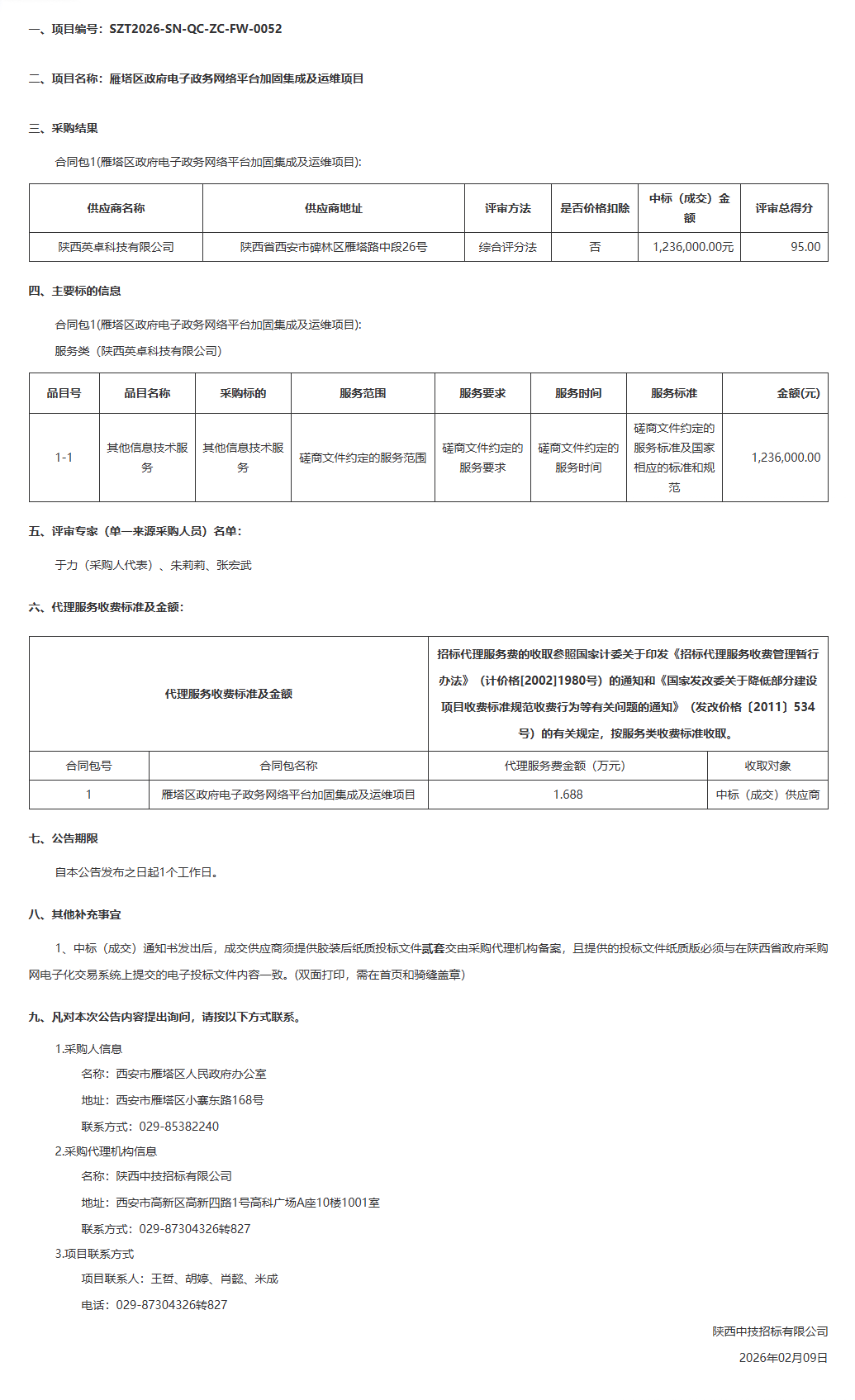 西安市雁塔区人民政府办公室雁塔区政府电子政务网络平台加固集成及运维项目中标(成交)结果公告