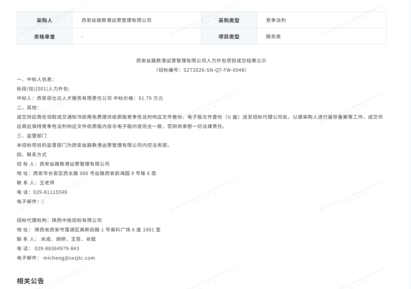 西安丝路数港运营管理有限公司人力外包项目中标公告