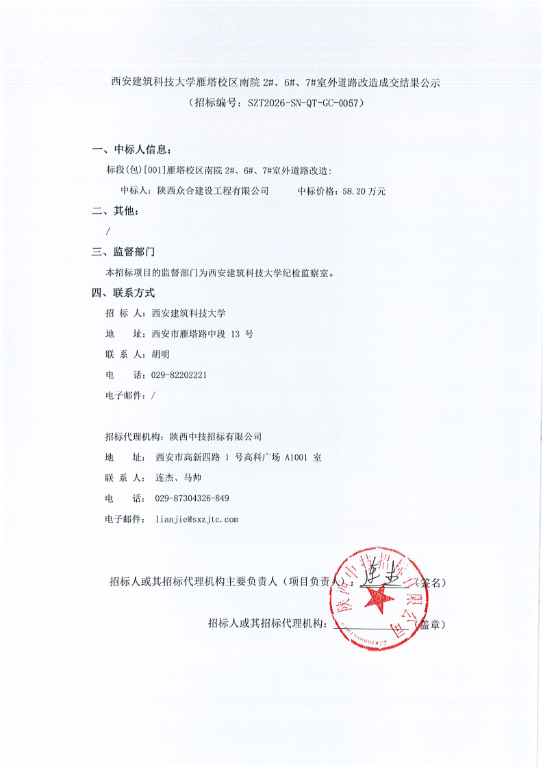 西安建筑科技大学雁塔校区南院2#、6#、7#室外道路改造成交结果公示