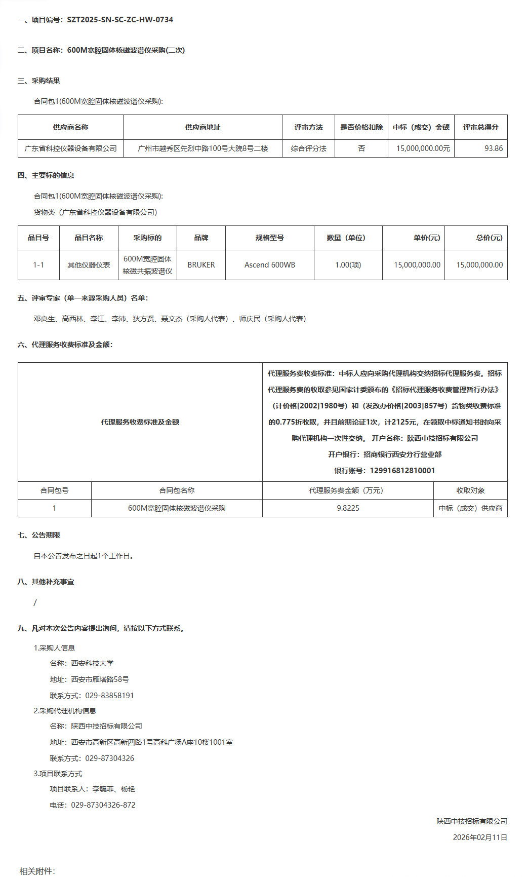 西安科技大学600M宽腔固体核磁波谱仪采购(二次)中标(成交)结果公告
