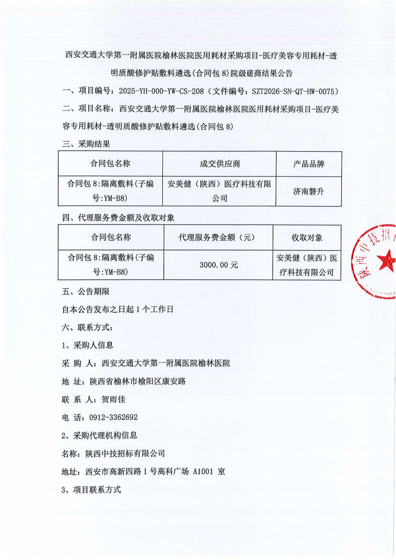 西安交通大学第一附属医院榆林医院医用耗材采购项目-医疗美容专用耗材-透明质酸修护贴敷料遴选(合同包8)院级磋商结果公告