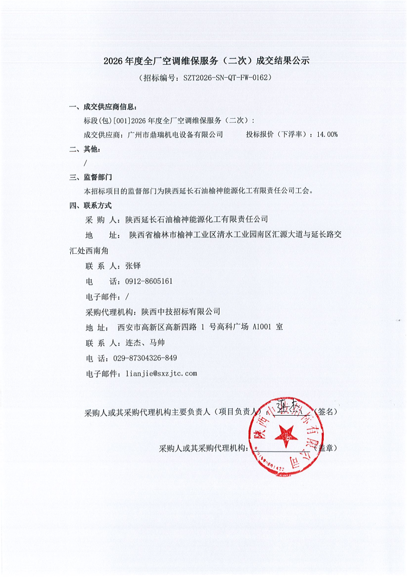 2026年度全厂空调维保服务(二次)成交结果公示