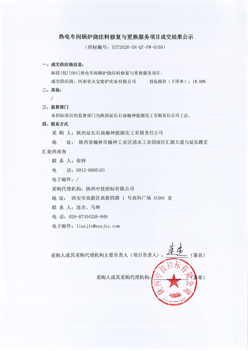热电车间锅炉浇注料修复与更换服务项目成交结果公示