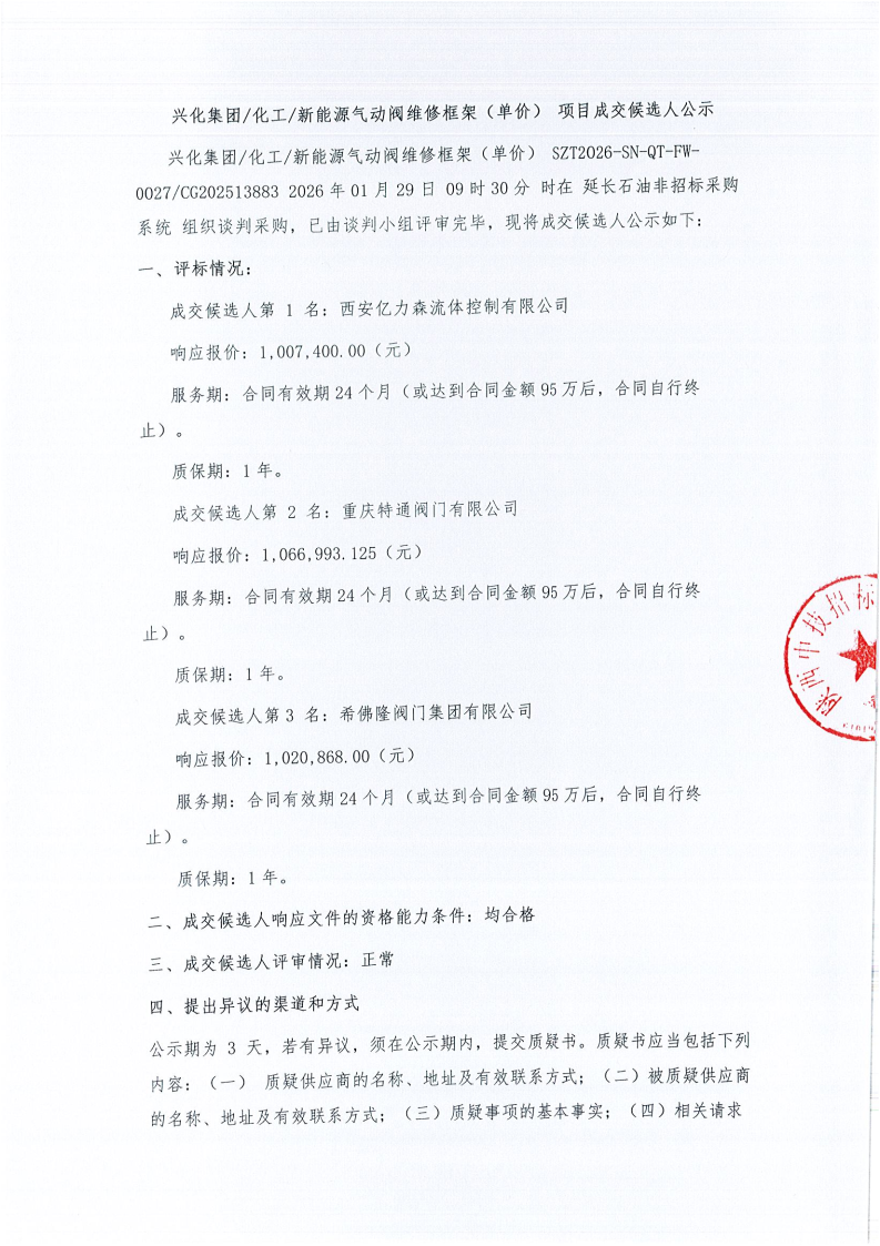 兴化集团、化工、新能源气动阀维修框架(单价)项目成交候选人公示