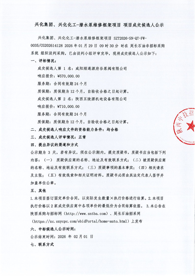 兴化集团、兴化化工-潜水泵维修框架项目 项目成交候选人公示