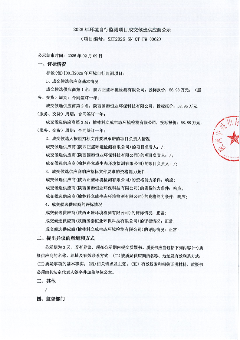 2026年环境自行监测项目成交候选供应商公示