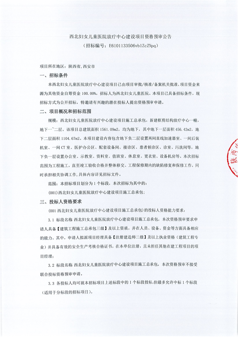 西北妇女儿童医院放疗中心建设项目资格预审公告