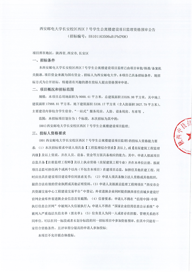 西安邮电大学长安校区西区7号学生公寓楼建设项目监理资格预审公告