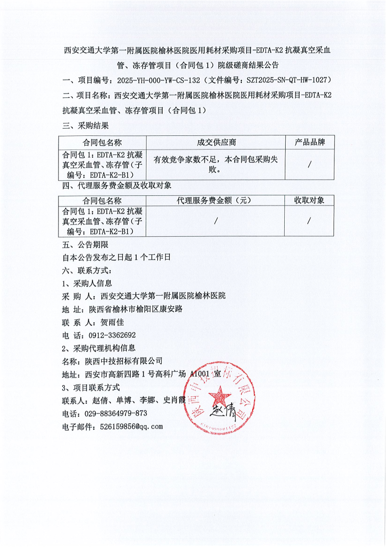 西安交通大学第一附属医院榆林医院医用耗材采购项目-EDTA-K2抗凝真空采血管、冻存管项目(合同包1)院级磋商结果公告