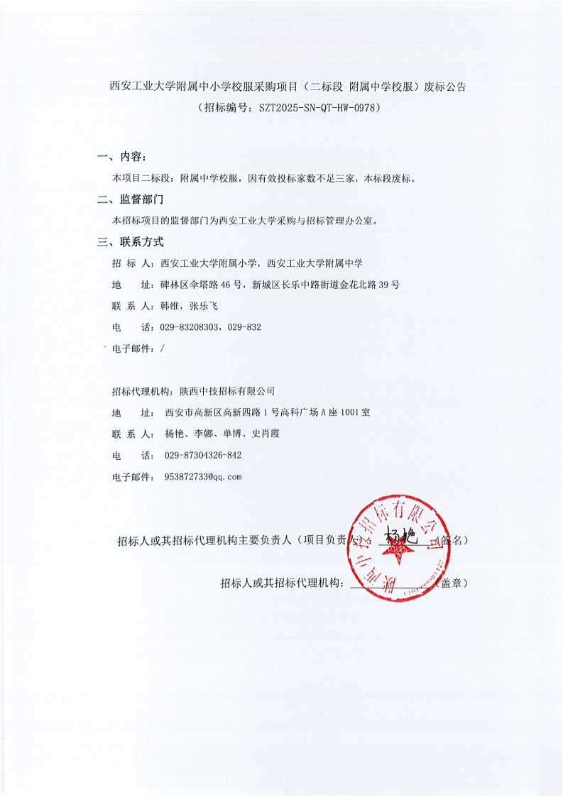 西安工业大学附属中小学校服采购项目(二标段 附属中学校服)废标公告