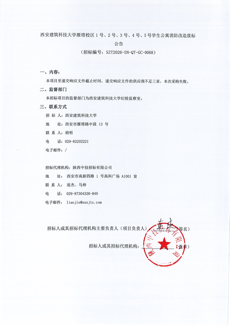 西安建筑科技大学雁塔校区1号、2号、3号、4号、5号学生公寓消防改造废标公告
