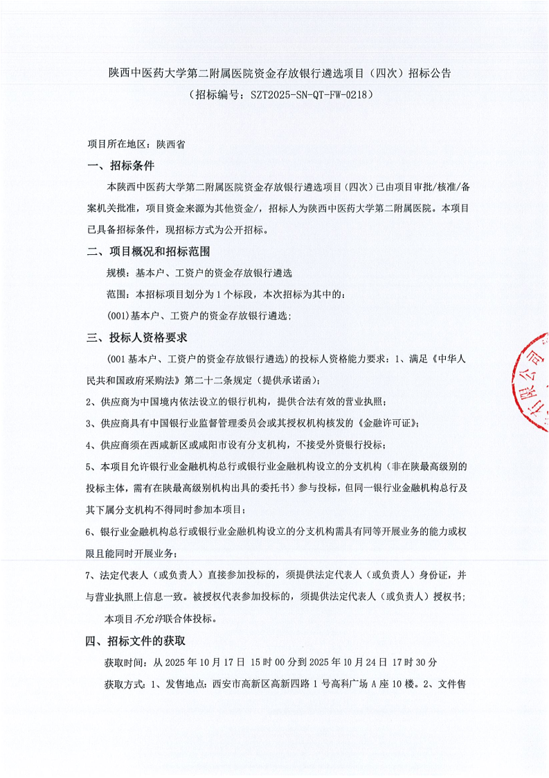 陕西中医药大学第二附属医院资金存放银行遴选项目(四次)招标公告