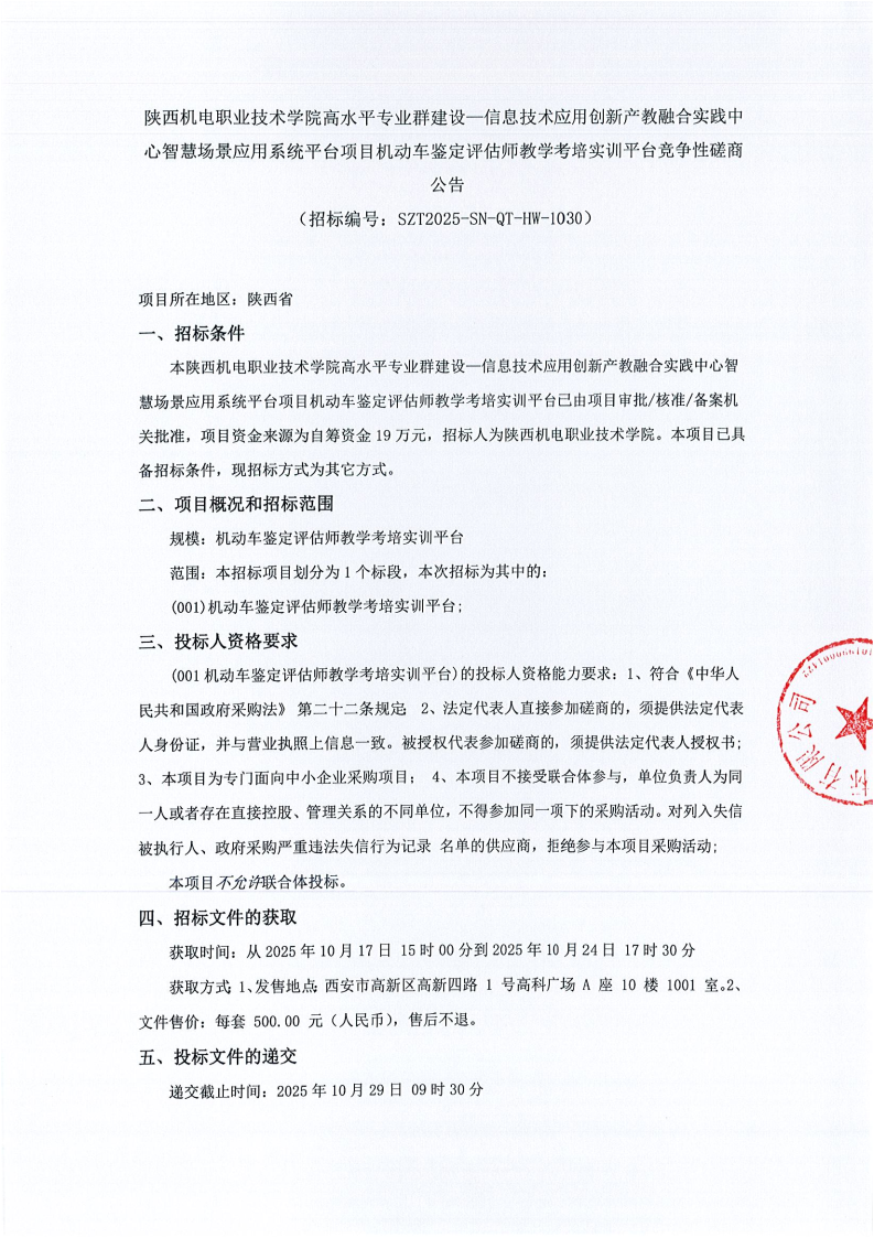 陕西机电职业技术学院高水平专业群建设—信息技术应用创新产教融合实践中心智慧场景应用系统平台项目机动车鉴定评估师教学考培实训平台竞争性磋商公告