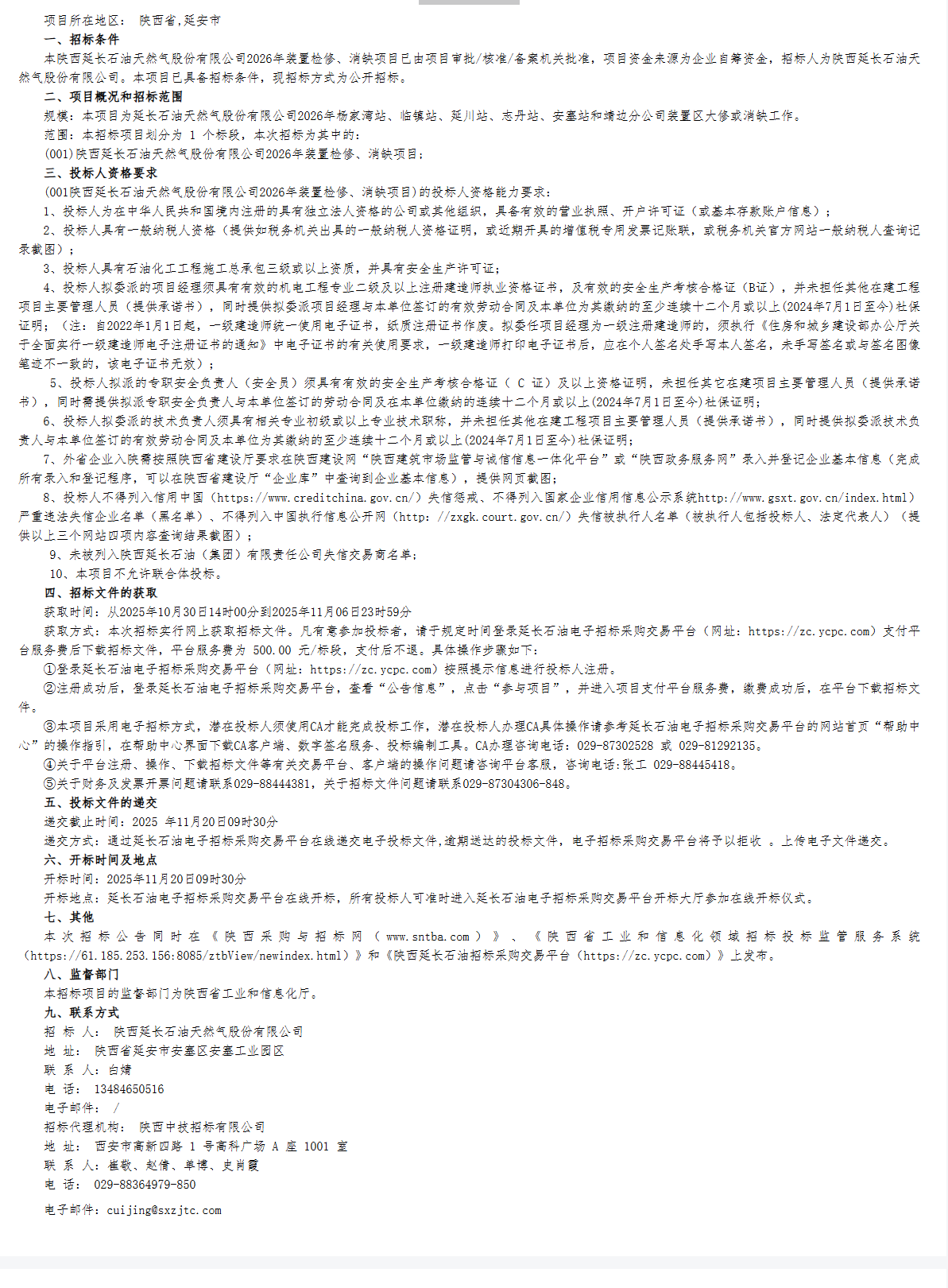 陕西延长石油天然气股份有限公司2026年装置检修、消缺项目 公开招标公告