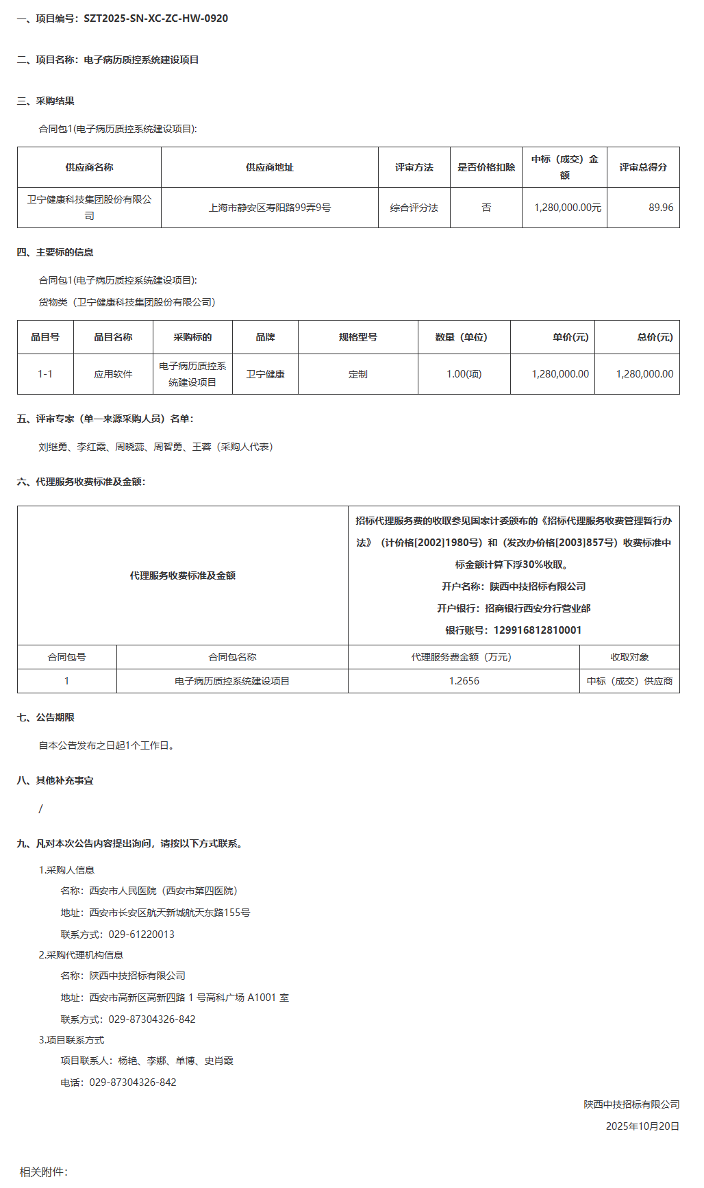 西安市人民医院(西安市第四医院)电子病历质控系统建设项目中标(成交)结果公告