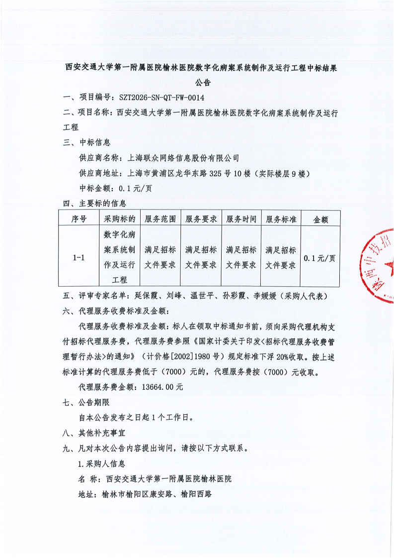 西安交通大学第一附属医院榆林医院数字化病案系统制作及运行工程中标结果公告