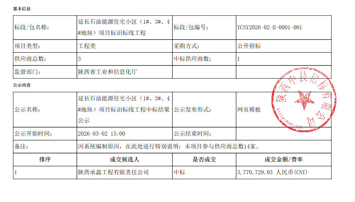 延长石油能源住宅小区(1#、3#、4#地块)项目标识标线工程中标结果公示