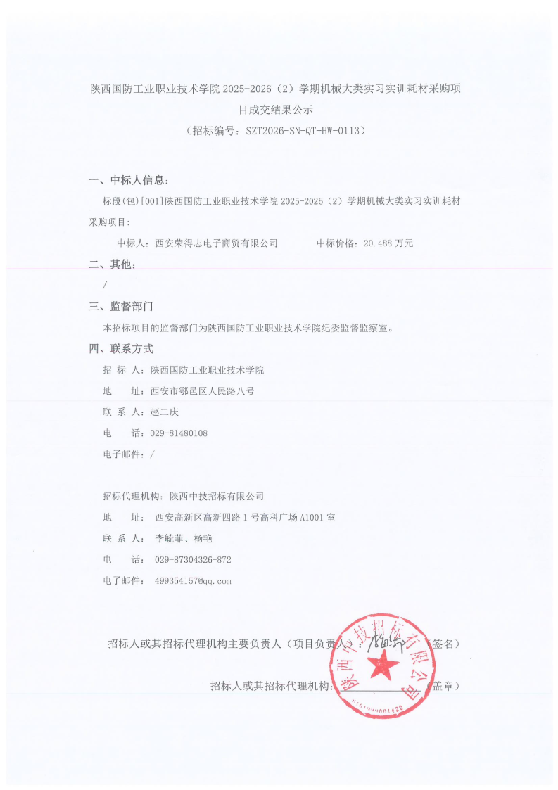 陕西国防工业职业技术学院2025-2026(2)学期机械大类实习实训耗材采购项目成交结果公示