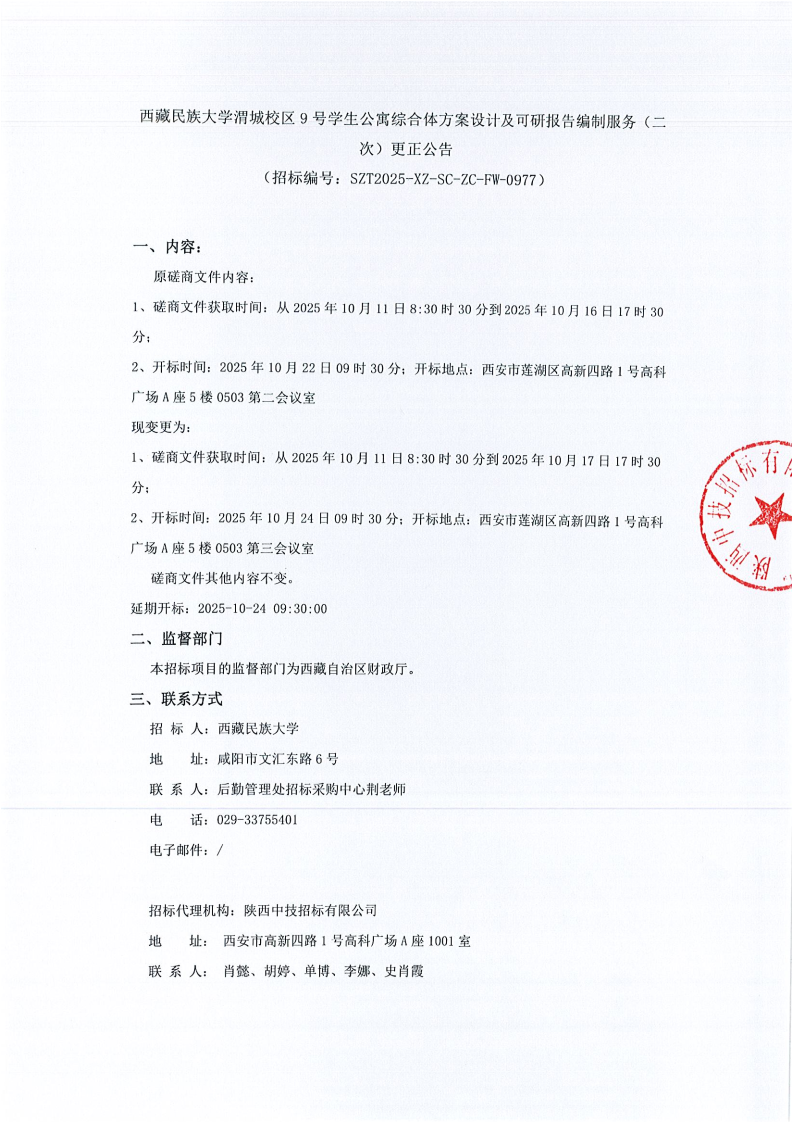 西藏民族大学渭城校区9号学生公寓综合体方案设计及可研报告编制服务(二次)更正公告