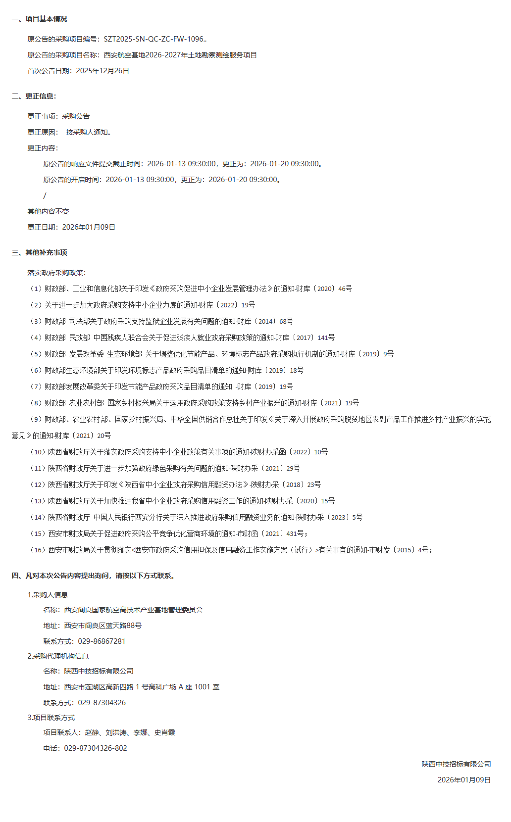 西安阎良国家航空高技术产业基地管理委员会西安航空基地2026-2027年土地勘察测绘服务项目采购更正公告(第一次)