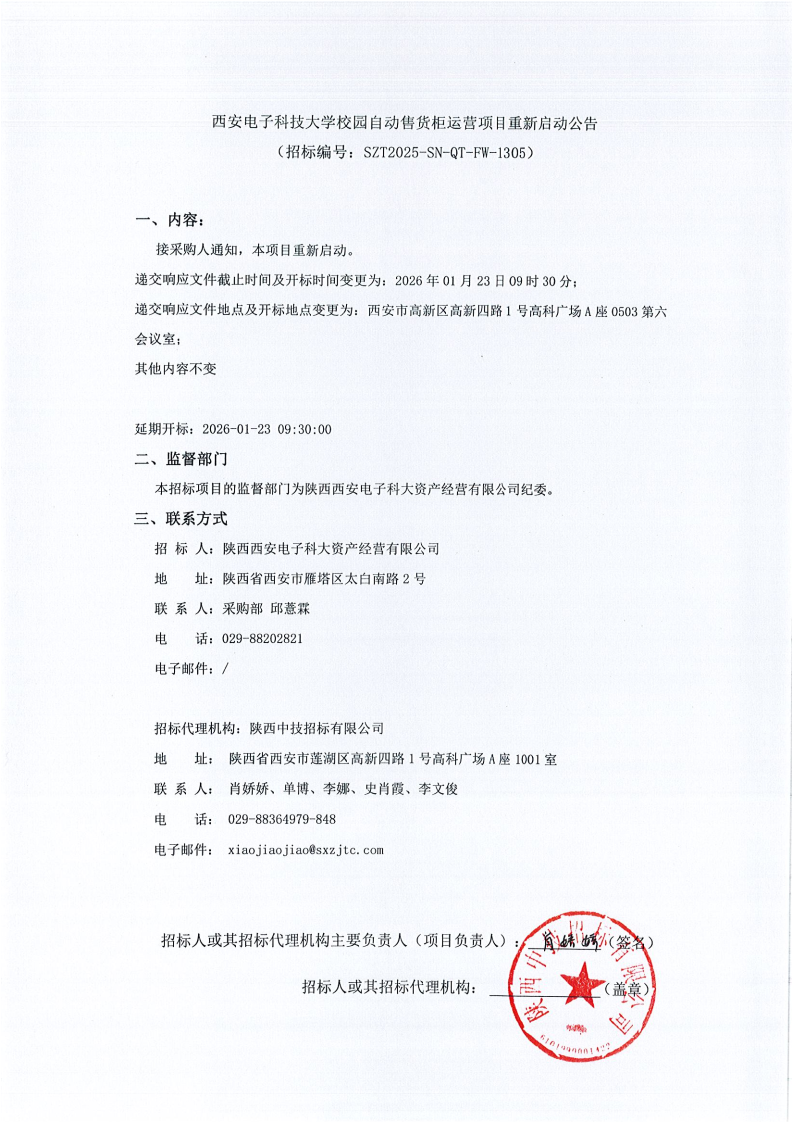 西安电子科技大学校园自动售货柜运营项目重新启动公告