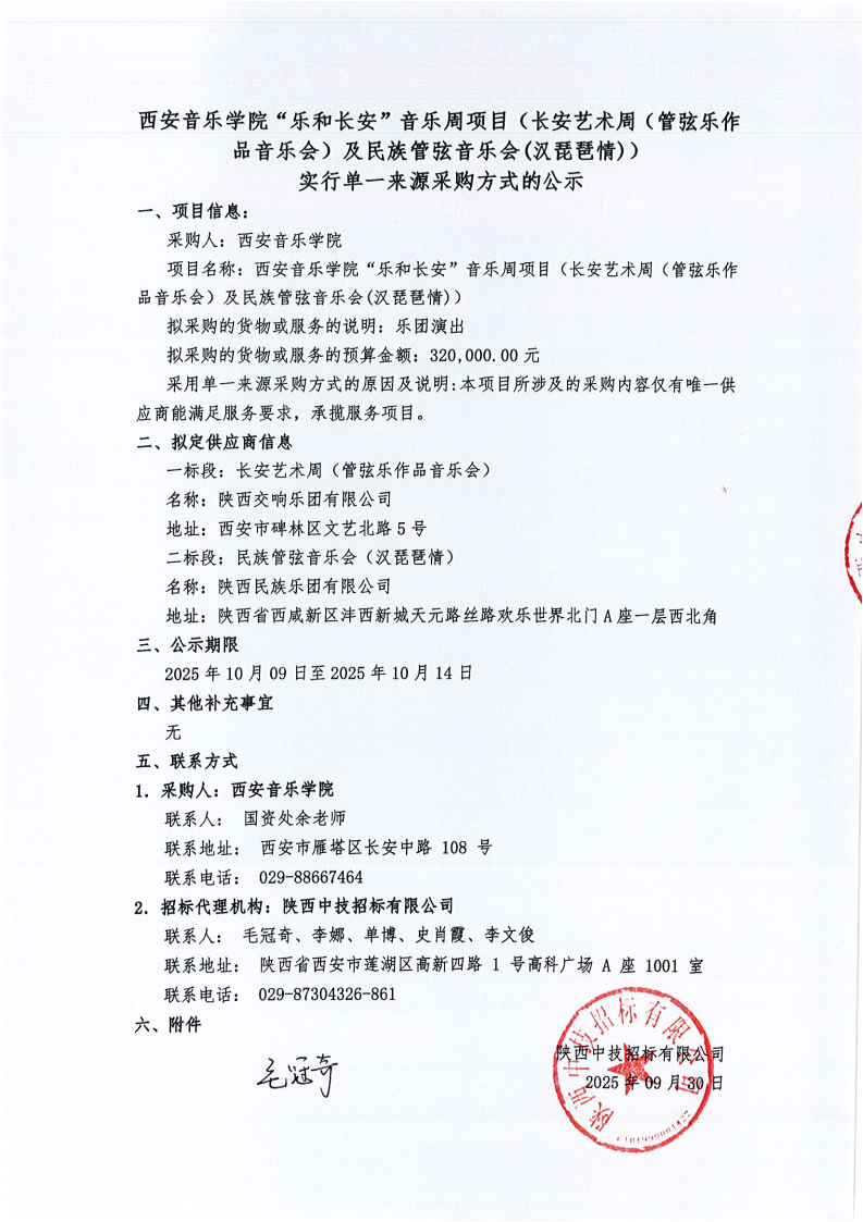 西安音乐学院“乐和长安”音乐周项目(长安艺术周(管弦乐作品音乐会)及民族管弦音乐会(汉琵琶情))实行单一来源采购方式的公示