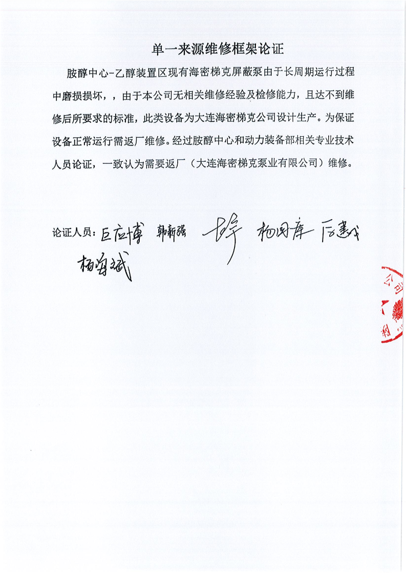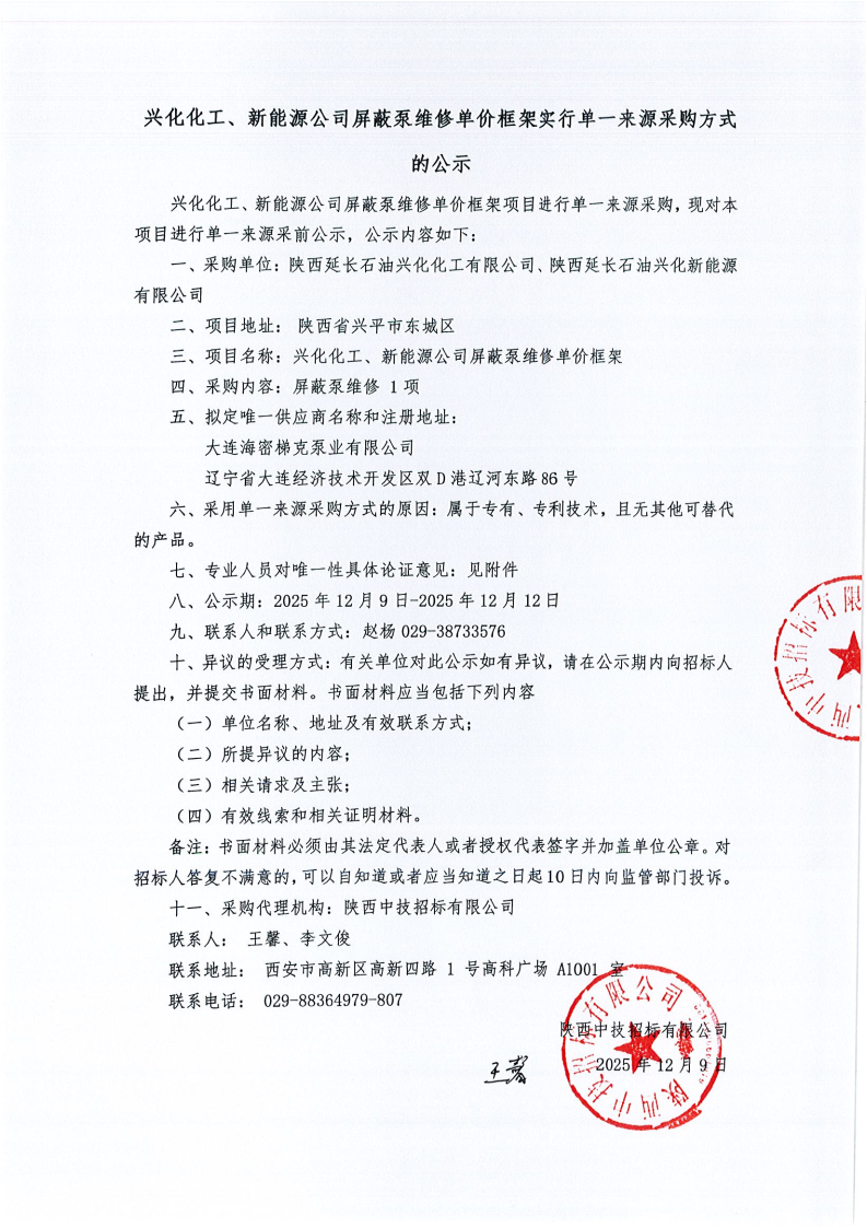 兴化化工、新能源公司屏蔽泵维修单价框架实行单一来源采购方式的公示