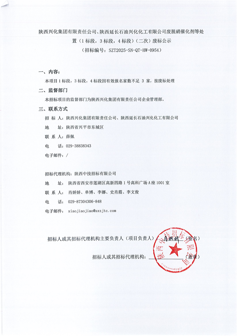 陕西兴化集团有限责任公司、陕西延长石油兴化化工有限公司废脱硝催化剂等处置(1标段,3标段,4标段)(二次)废标公示