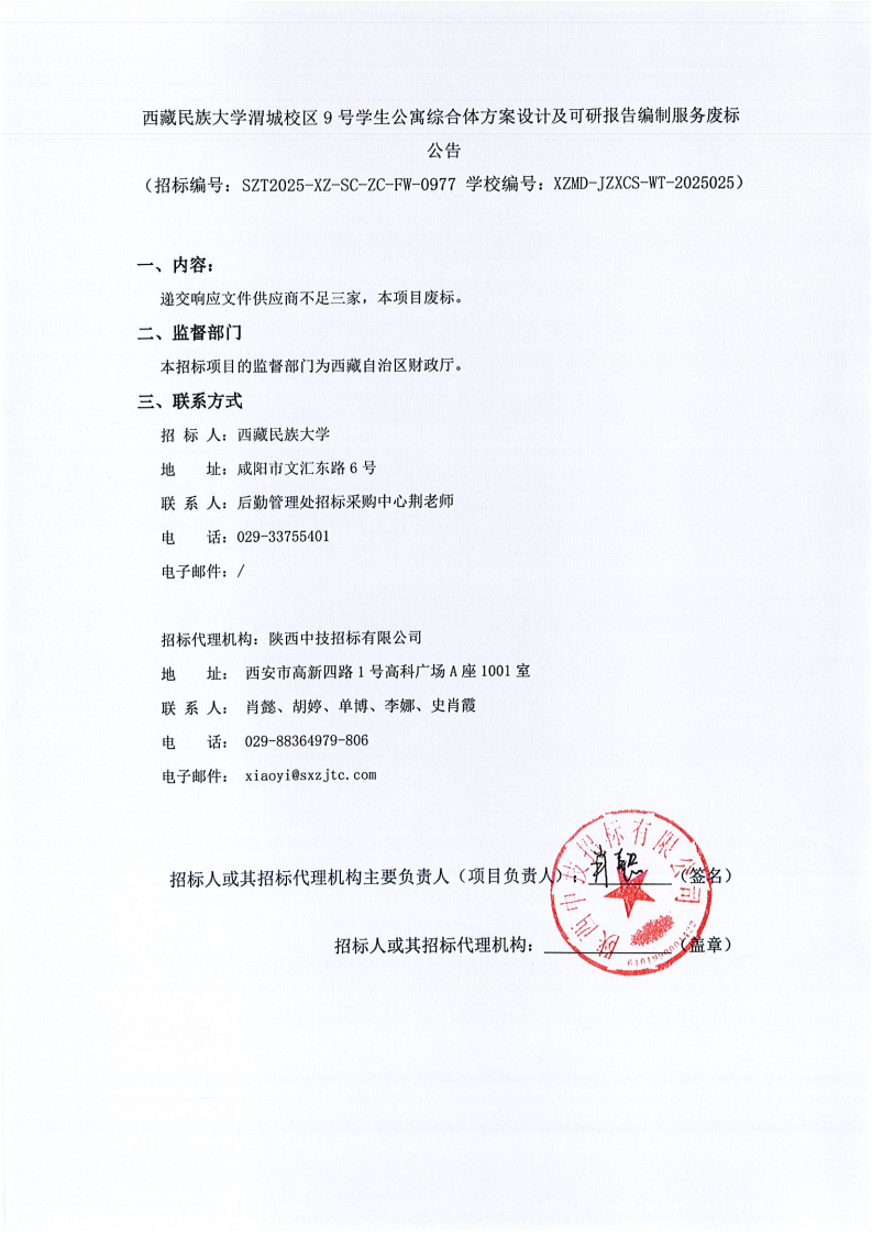 西藏民族大学渭城校区9号学生公寓综合体方案设计及可研报告编制服务废标公告