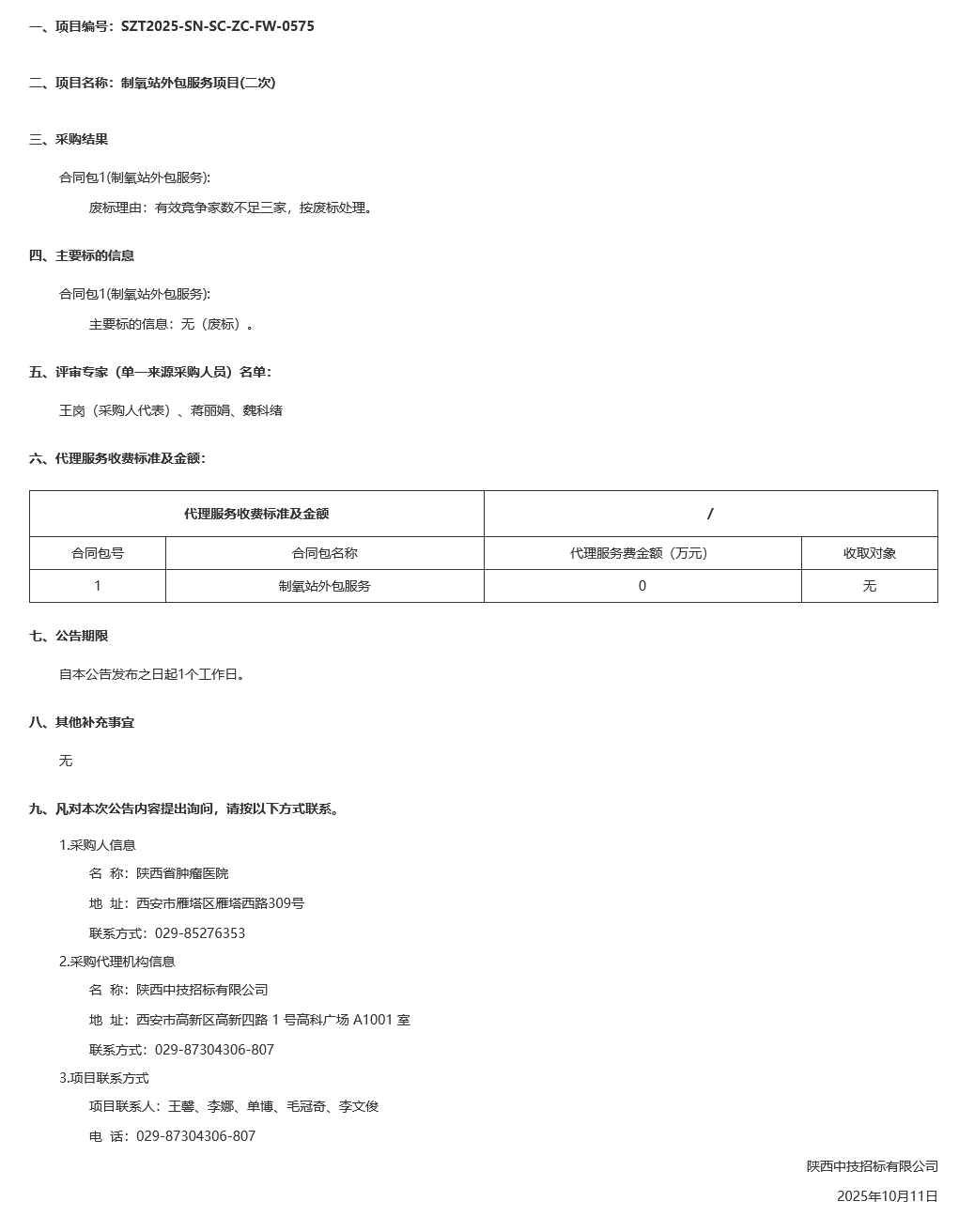 陕西省肿瘤医院制氧站外包服务项目(二次)废标公告