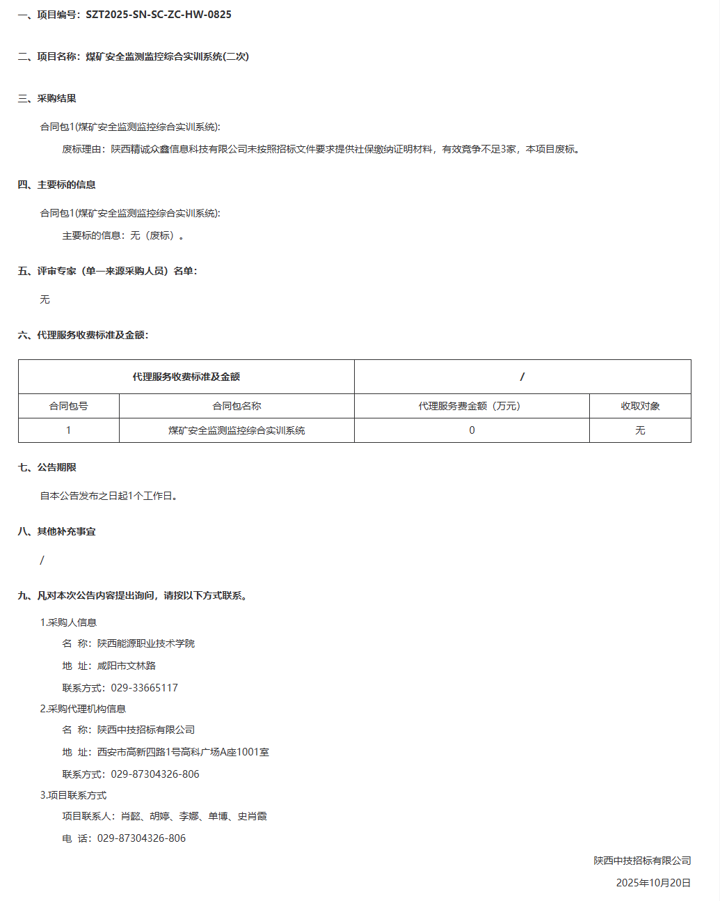 陕西能源职业技术学院煤矿安全监测监控综合实训系统(二次)结果公告