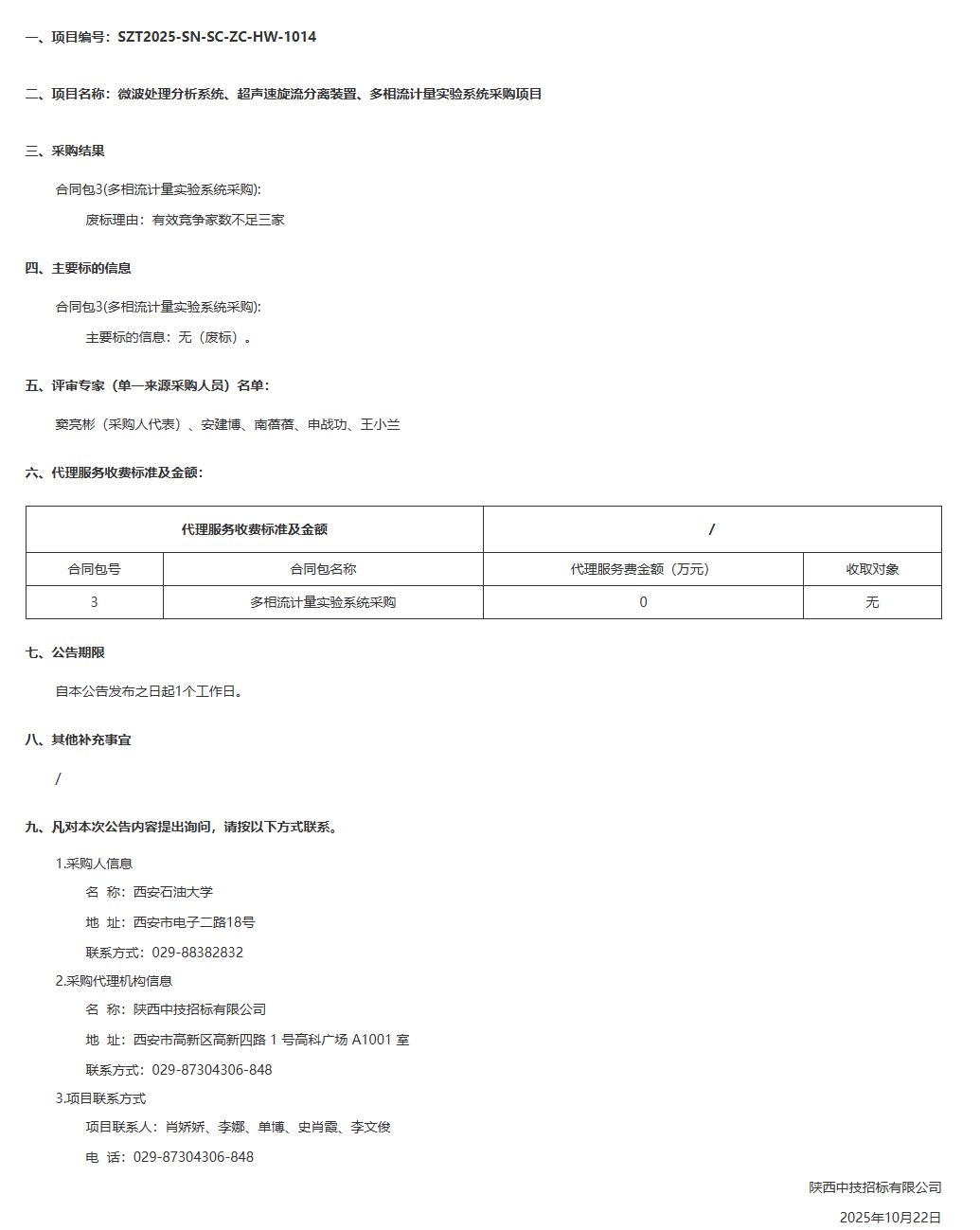 西安石油大学微波处理分析系统、超声速旋流分离装置、多相流计量实验系统采购项目结果公告