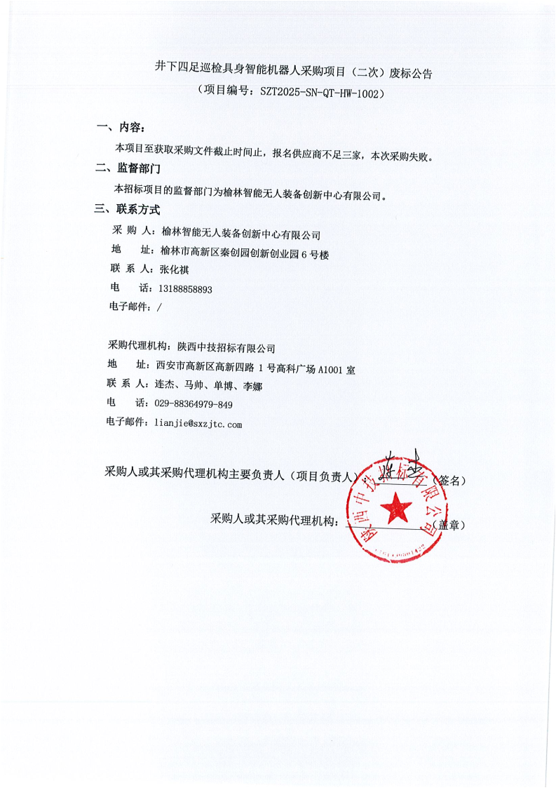 井下四足巡检具身智能机器人采购项目(二次)废标公告