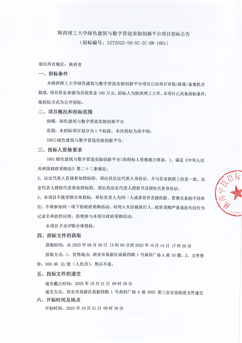陕西理工大学绿色建筑与数字营造实验创新平台项目招标公告