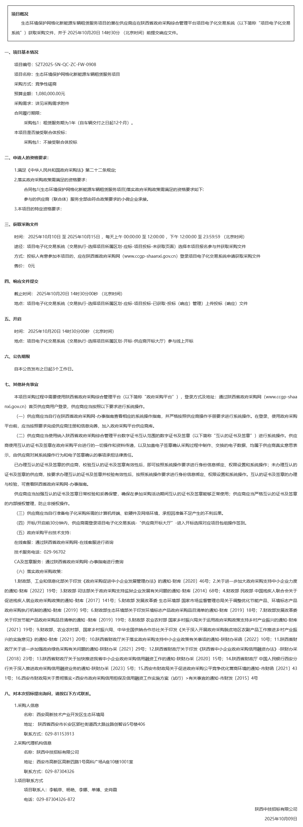 西安高新技术产业开发区生态环境局生态环境保护网格化新能源车辆租赁服务项目竞争性磋商公告