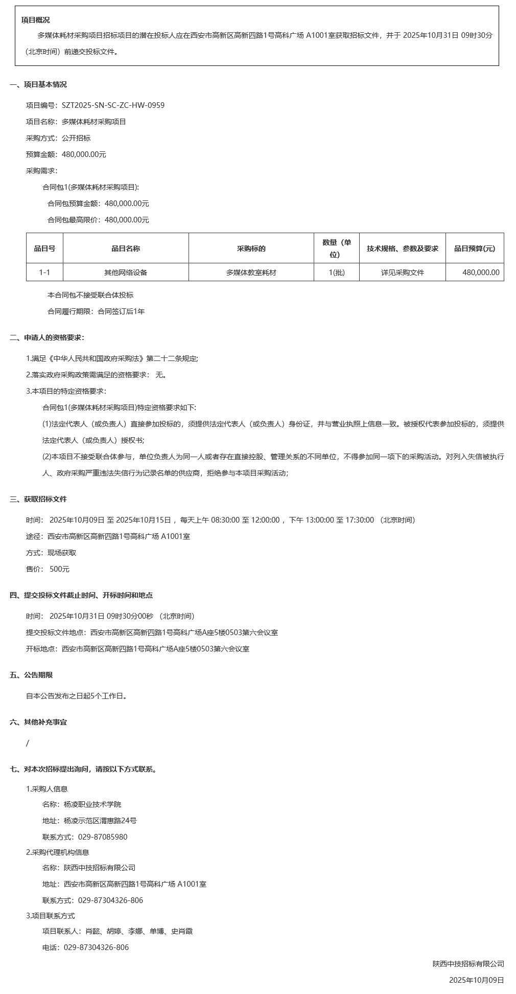 杨凌职业技术学院多媒体耗材采购项目招标公告