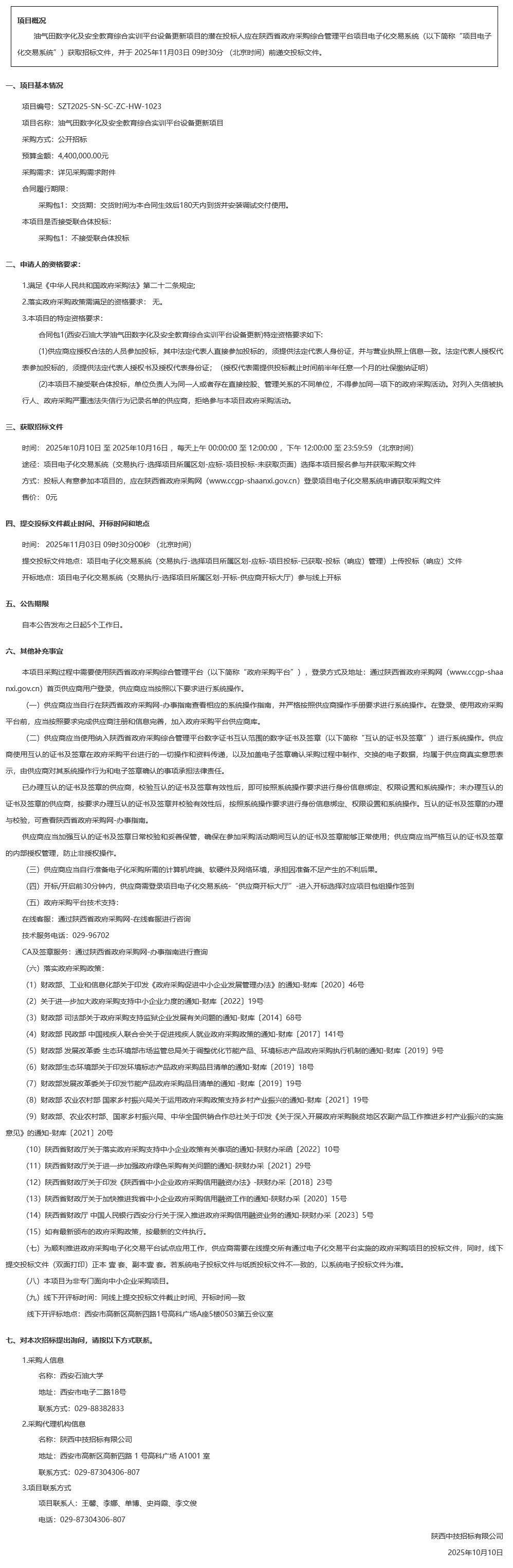 西安石油大学油气田数字化及安全教育综合实训平台设备更新项目招标公告