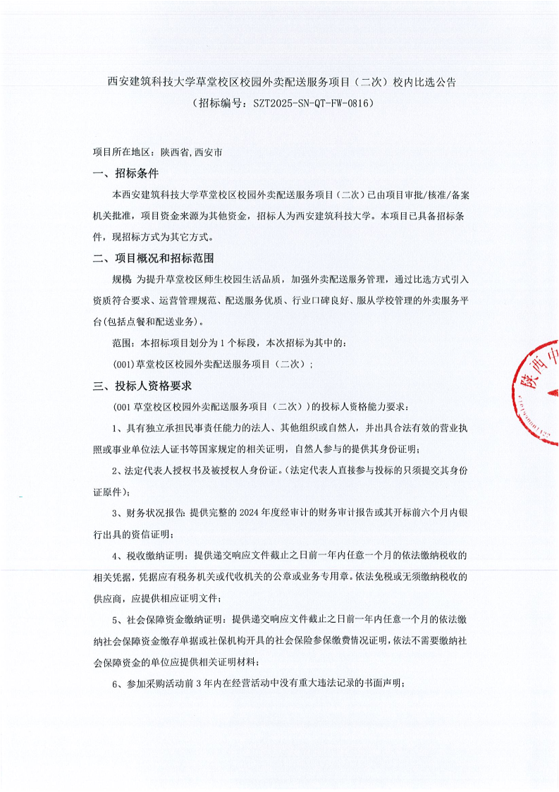 西安建筑科技大学草堂校区校园外卖配送服务项目(二次)校内比选公告