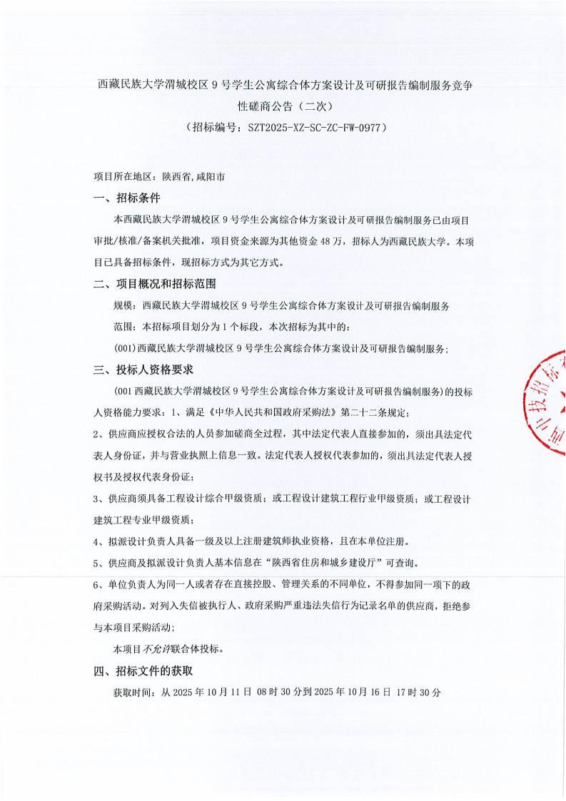 西藏民族大学渭城校区9号学生公寓综合体方案设计及可研报告编制服务竞争性磋商公告(二次)