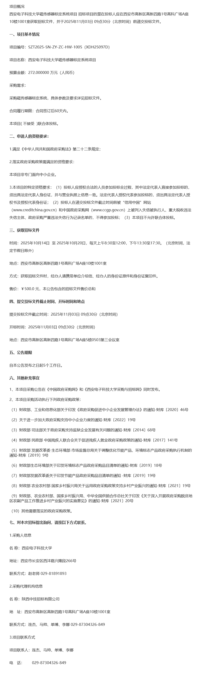 西安电子科技大学磁传感器标定系统项目公开招标公告