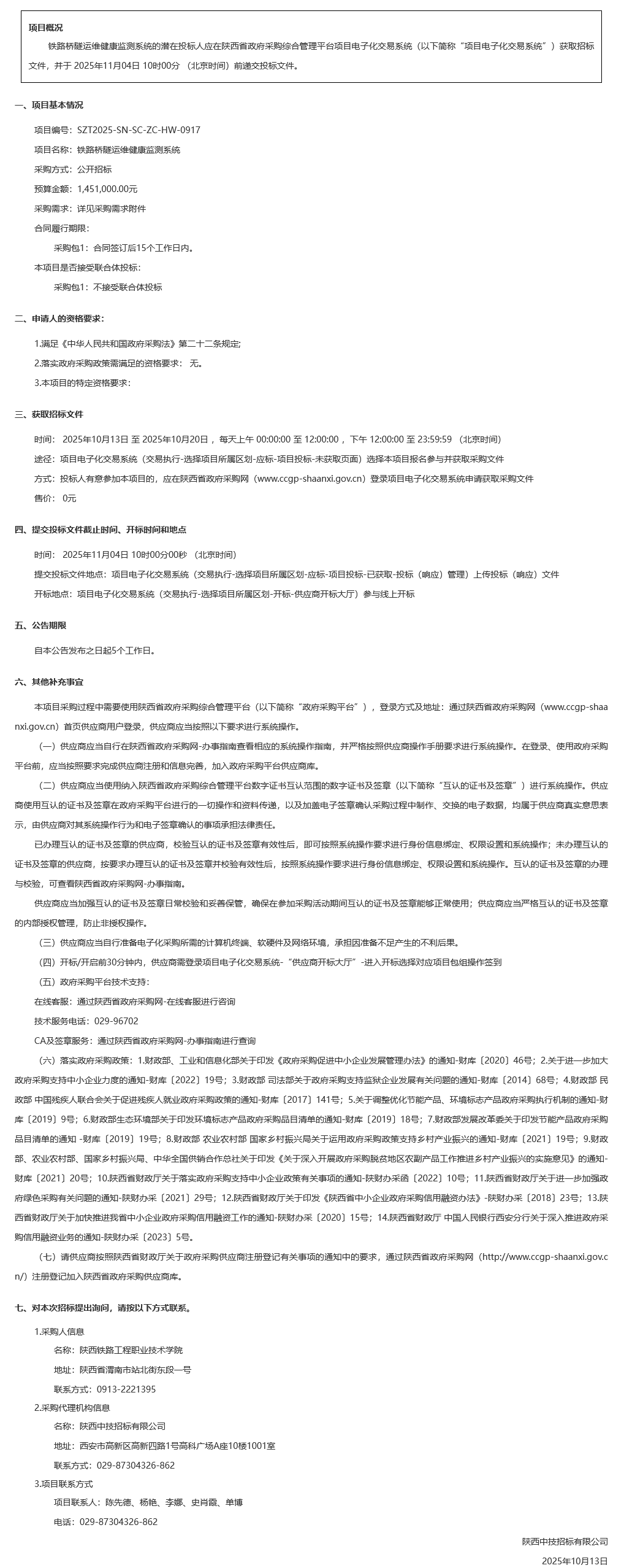 陕西铁路工程职业技术学院铁路桥隧运维健康监测系统采购项目招标公告