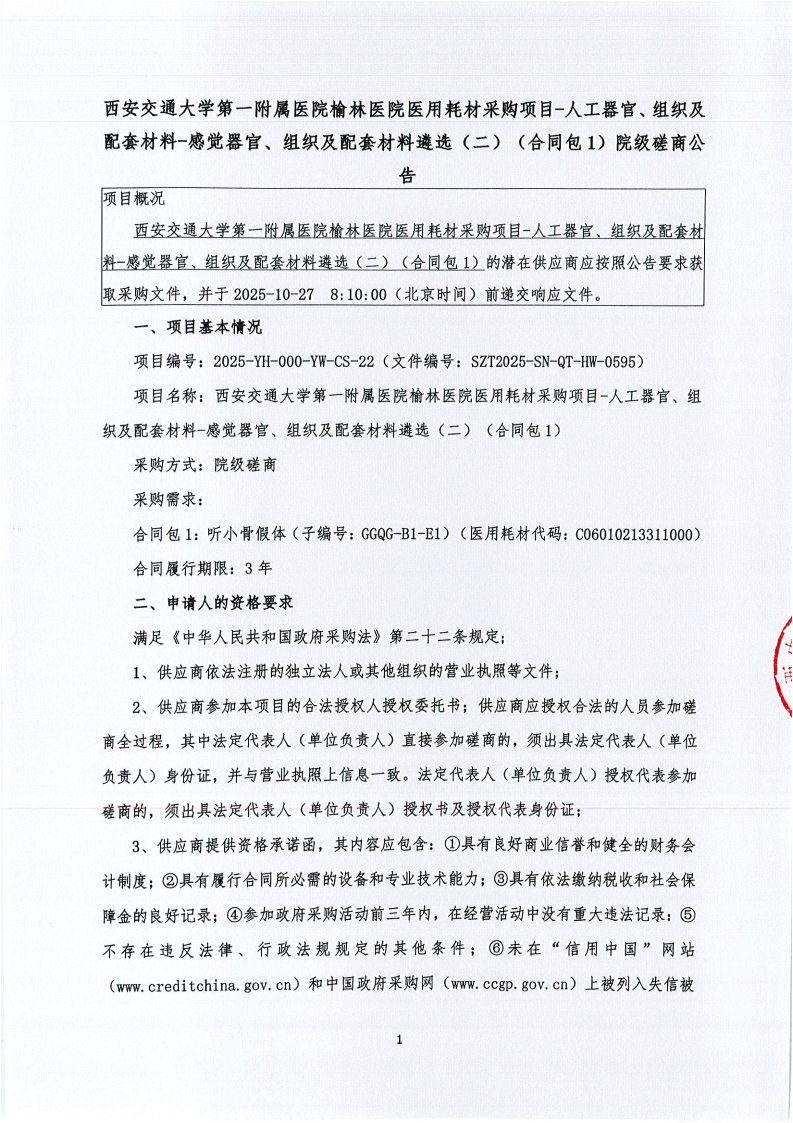 西安交通大学第一附属医院榆林医院医用耗材采购项目-人工器官、组织及配套材料-感觉器官、组织及配套材料遴选(二)(合同包1)院级磋商公告