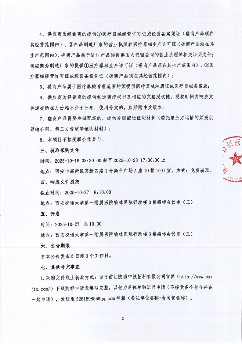 西安交通大学第一附属医院榆林医院医用耗材采购项目-血管介入治疗类材料-外周血管介入治疗材料遴选(二)(二次)(合同包1-12)院级磋商公告