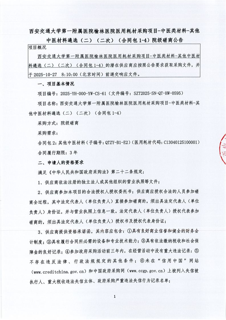 西安交通大学第一附属医院榆林医院医用耗材采购项目-中医类材料-其他中医材料遴选(二)(二次)(合同包1-4)院级磋商公告