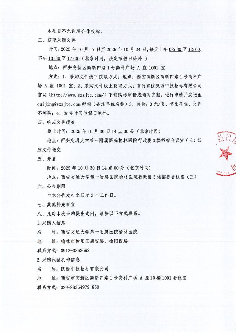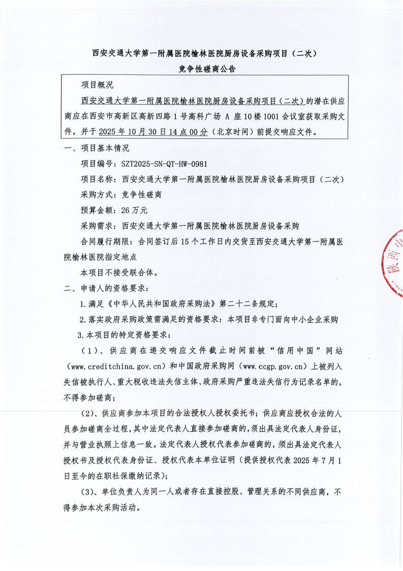 西安交通大学第一附属医院榆林医院厨房设备采购项目(二次)竞争性磋商公告